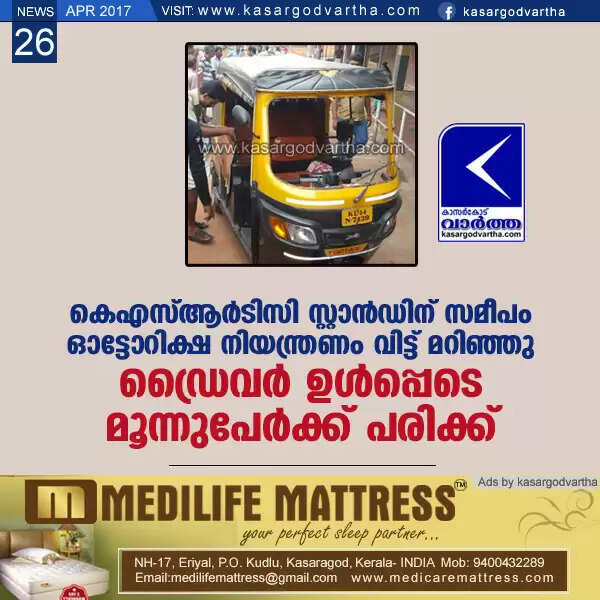 Keywords: Kasaragod, KSRTC, Autorickshaw, Driver, Injured, Bus stand, Road, Vehicle, Hospital, Autorickshaw accident; Three injured.