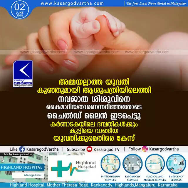 അമ്മയല്ലാത്ത യുവതി കുഞ്ഞുമായി ആശുപത്രിയിലെത്തി; നവജാത ശിശുവിനെ കൈമാറിയതാണെന്നറിഞ്ഞതോടെ ചൈല്‍ഡ് ലൈന്‍ ഇടപെട്ടു, കര്‍ണാടകയിലെ ദമ്പതികള്‍ക്കും കുട്ടിയെ വാങ്ങിയ യുവതിക്കുമെതിരെ കേസ്