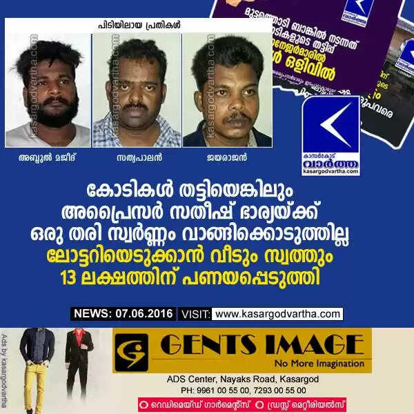 കോടികള്‍ തട്ടിയെങ്കിലും അപ്രൈസര്‍ സതീഷ് ഭാര്യയ്ക്ക് ഒരു തരി സ്വര്‍ണ്ണം വാങ്ങിക്കൊടുത്തില്ല; ലോട്ടറിയെടുക്കാന്‍ വീടും സ്വത്തും 13 ലക്ഷത്തിന് പണയപ്പെടുത്തി