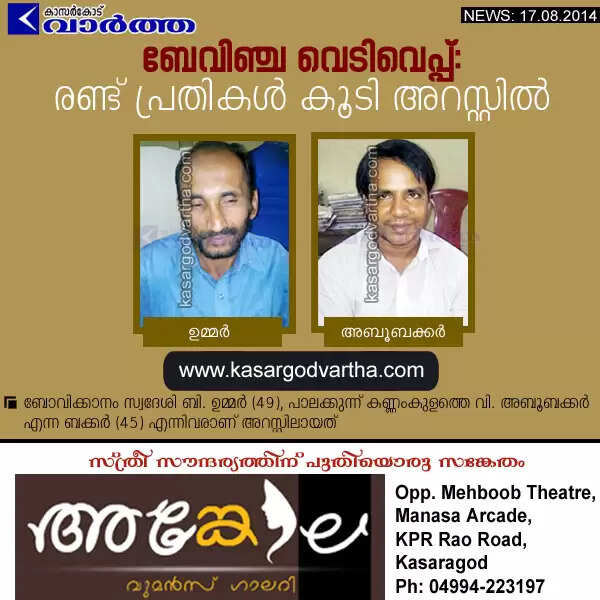 കാസര്കോട്: (www.kasargodvartha.com 17.08.2014) പ്രമാദമായ ബേവിഞ്ച വെടിവെപ്പ് കേസില് രണ്ട് പ്രതികളെ പോലീസ് അറസ്റ്റ് ചെയ്തു. കേസിലെ മൂന്നാം പ്രതി ബോവിക്കാനം സ്വദേശിയും നെല്ലിക്കുന്ന് ചേരങ്കൈ ഹൗസില് താമസക്കാരനുമായ ബി. ഉമ്മര് (49), 10-ാം പ്രതി പാലക്കുന്ന് കണ്ണംകുളം നൗഷിഫ് മന്സിലിലെ വി. അബൂബക്കര് എന്ന ബക്കര് (45) എന്നിവരെയാണ് ശനിയാഴ്ച രാത്രി കാസര്കോട് ഡി.വൈ.എസ്.പി ടി.പി രഞ്ജിത്ത്, ടൗണ് സി.ഐ ജേക്കബ് എന്നിവരുടെ നേതൃത്വത്തിലുള്ള പോലീസ് സംഘം അറസ്റ്റ് ചെയ്തത്.