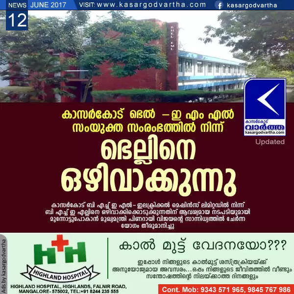 തിരുവനന്തപുരം: (www.kasargodvartha.com 12.06.2017) സംയുക്ത സംരംഭമായ കാസര്‍കോട് ബി എച്ച് ഇ എല്‍ - ഇലക്ട്രിക്കല്‍ മെഷിന്‍സ് ലിമിറ്റഡില്‍ നിന്ന് ബി എച്ച് ഇ എല്ലിനെ ഒഴിവാക്കിക്കൊടുക്കുന്നതിന് ആവശ്യമായ നടപടിയുമായി മുന്നോട്ടുപോകാന്‍ മുഖ്യമന്ത്രി പിണറായി വിജയന്റെ സാന്നിധ്യത്തില്‍ ചേര്‍ന്ന യോഗം തീരുമാനിച്ചു. ഇതിന്റെ ഭാഗമായി കമ്പനിയുടെ ആസ്തി - ബാധ്യതകള്‍ ഉടനെ തിട്ടപ്പെടുത്തും.