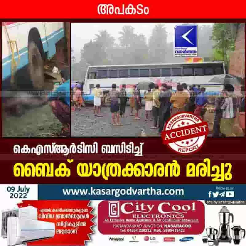Keywords: News, Kerala, KSRTC Bus, Bike Rider Dies, Police, Bike Rider, Accident, kasaragod, Vellarikundu,Top-Headlines, Bike, Dead, Bike rider died after being hit by KSRTC bus.