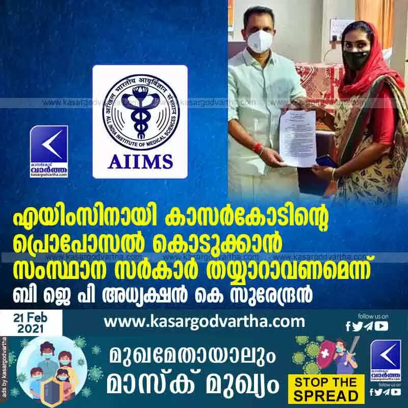 എയിംസിനായി കാസര്‍കോടിന്റെ പ്രൊപോസല്‍ കൊടുക്കാന്‍ സംസ്ഥാന സര്‍കാര്‍ തയ്യാറാവണമെന്ന് ബി ജെ പി അധ്യക്ഷന്‍ കെ സുരേന്ദ്രന്‍