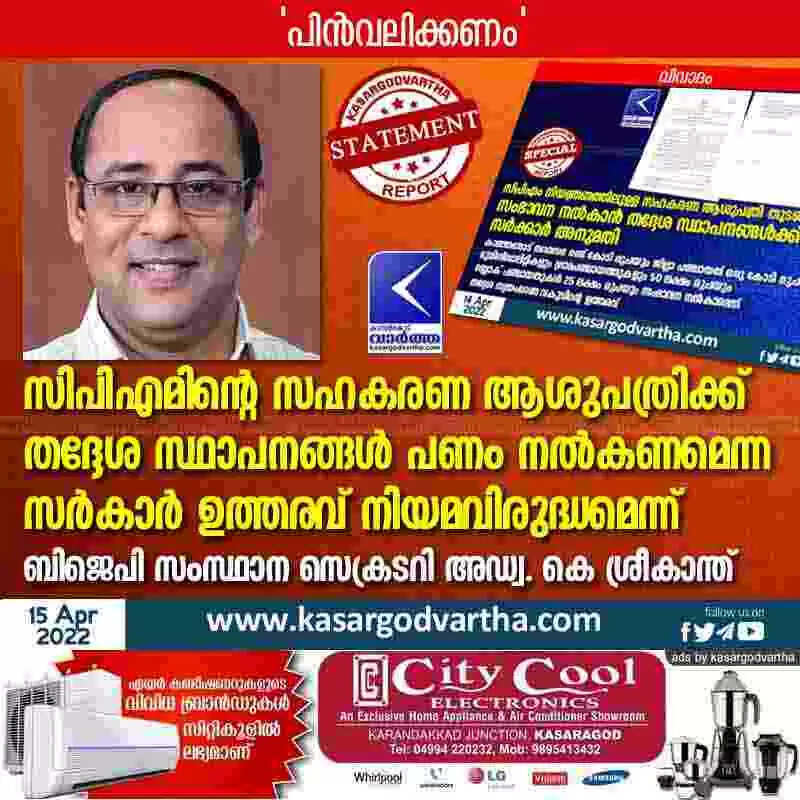 Keywords: News, Kerala, Kasaragod, Top-Headlines, BJP, CPM, Controversy, Government, Hospital, Adv.Srikanth, Pinarayi-Vijayan, Political party, CPM's co-operative hospital, BJP state secretary says government order for local bodies to pay for CPM's co-operative hospital is illegal.