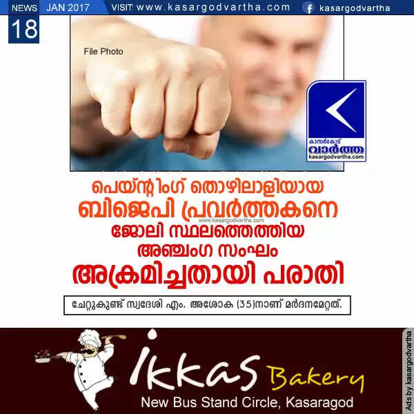 കാഞ്ഞങ്ങാട്: (www.kasargodvartha.com 18/01/2017) പെയ്ന്റിംഗ് തൊഴിലാളിയായ ബിജെപി പ്രവര്ത്തകനെ ജോലി സ്ഥലത്തെത്തിയ അഞ്ചംഗ സംഘം അക്രമിച്ചതായി പരാതി. ചേറ്റുകുണ്ട് സ്വദേശി എം. അശോക (35)നാണ് മര്ദനമേറ്റത്. സംഭവത്തില് അഞ്ചു പേര്ക്കെതിരെ ഹൊസ്ദുര്ഗ് പോലീസ് കേസെടുത്തു.