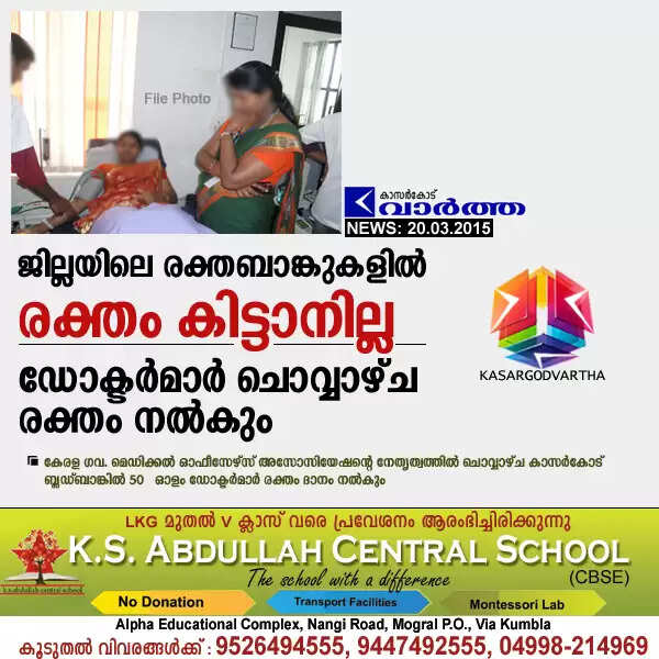 ജില്ലയിലെ രക്തബാങ്കുകളില്‍ രക്തം കിട്ടാനില്ല; ഡോക്ടര്‍മാര്‍ ചൊവ്വാഴ്ച രക്തം നല്‍കും