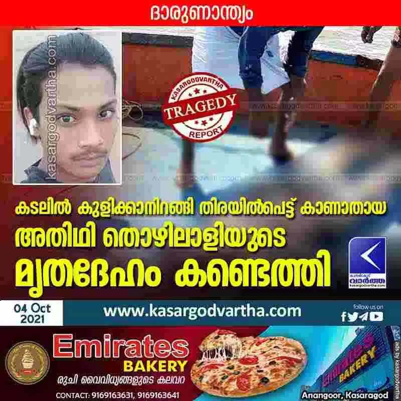 കടലിൽ കുളിക്കാനിറങ്ങി തിരയിൽപെട്ട് കാണാതായ അതിഥി തൊഴിലാളിയുടെ മൃതദേഹം കണ്ടെത്തി