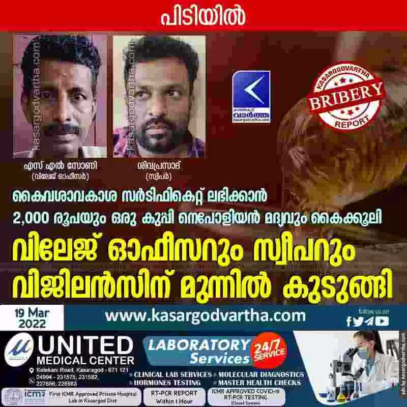 കാസര്‍കോട്: (www.kasargodvartha.com 19.03.2022) കൈവശാവകാശ സര്‍ടിഫികറ്റ് ലഭിക്കാന്‍ 2,000 രൂപയും ഒരു കുപ്പി നെപോളിയന്‍ മദ്യവും കൈക്കൂലി വാങ്ങിയ വിലേജ് ഓഫീസറും സ്വീപറും വിജിലന്‍സിന്റെ പിടിയിലായി. നെട്ടണിഗെ വിലേജ് ഓഫീസര്‍ തിരുവനന്തപുരം സ്വദേശി എസ് എല്‍ സോണി, സ്വീപര്‍ ആദൂരിലെ ശിവപ്രസാദ് എന്നിവരെയാണ് കാസര്‍കോട് വിജിലന്‍സ് ഡി വൈ എസ് പി കെ വി വേണുഗോപാലും സംഘവും അറസ്റ്റ് ചെയ്തത്. ശനിയാഴ്ച വൈകീട്ടാണ് വിജിലന്‍സ് സംഘം പ്രതികളെ പിടികൂടിയത്.