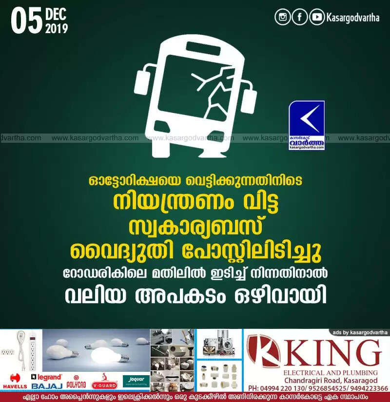 ഓട്ടോറിക്ഷയെ വെട്ടിക്കുന്നതിനിടെ നിയന്ത്രണം വിട്ട സ്വകാര്യബസ് വൈദ്യുതി പോസ്റ്റിലിടിച്ചു; റോഡരികിലെ മതിലില്‍ ഇടിച്ച് നിന്നതിനാല്‍ വലിയ അപകടം ഒഴിവായി