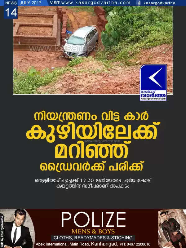 കാസര്‍കോട്: (www.kasargodvartha.com 14.07.2017) ചളിയംകോട് കയറ്റത്തിന് സമീപം കാര്‍ കുഴിയിലേക്ക് മറിഞ്ഞ് ഡ്രൈവര്‍ക്ക് പരിക്കേറ്റു. ഉദുമയിലെ താജ് ഹോട്ടലിന്റെ ഇന്നോവ കാറാണ് മറിഞ്ഞത്. വെള്ളിയാഴ്ച ഉച്ചക്ക് 12.30 മണിയോടെയാണ് അപകടം. ഉദുമയില്‍ നിന്നും കാസര്‍കോട്ടേക്ക് വരികയായിരുന്ന കാറാണ് ചളിയംകോട് ഇറക്കത്തില്‍ നിയന്ത്രണം വിട്ട് 15 അടി താഴ്ചയിലേക്ക് മറിഞ്ഞത്.
