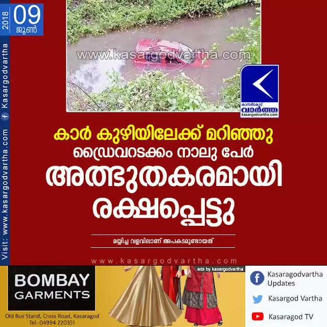 കാര് കുഴിയിലേക്ക് മറിഞ്ഞു; ഡ്രൈവറടക്കം നാലു പേര് അത്ഭുതകരമായി രക്ഷപ്പെട്ടു