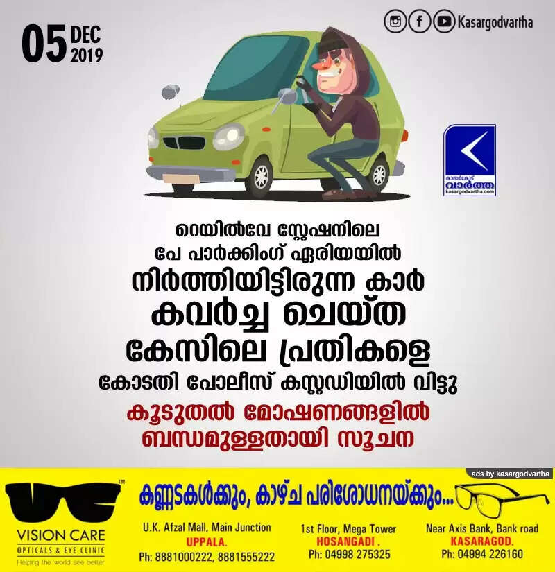 റെയില്വേ സ്റ്റേഷനിലെ പേ പാര്ക്കിംഗ് ഏരിയയില് നിര്ത്തിയിട്ടിരുന്ന കാര് കവര്ച്ച ചെയ്ത കേസിലെ പ്രതികളെ കോടതി പോലീസ് കസ്റ്റഡിയില് വിട്ടു; കൂടുതല് മോഷണങ്ങളില് ബന്ധമുള്ളതായി സൂചന
