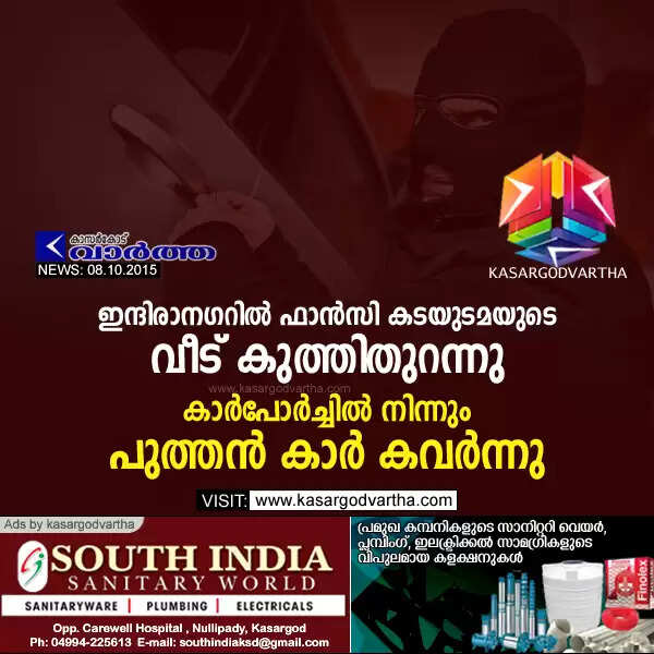 ഇന്ദിരാനഗറില് ഫാന്സി കടയുടമയുടെ വീട് കുത്തിതുറന്നു; കാര്പോര്ച്ചില് നിന്നും പുത്തന് കാര് കവര്ന്നു