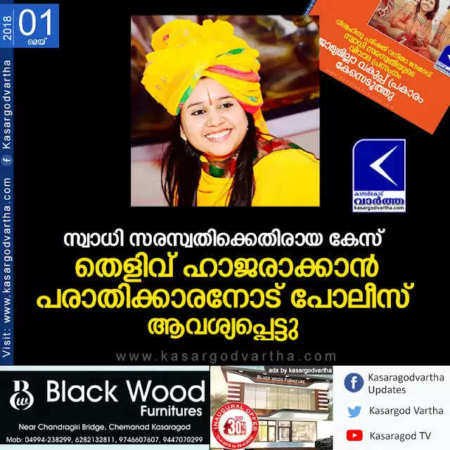 Keywords: Kasaragod, Kerala, News, Police, Case, Swathi saraswati, Police Complaint, Politics, VHP, Case against Swathi Saraswathi; Police order to complainant to submit Evidence.