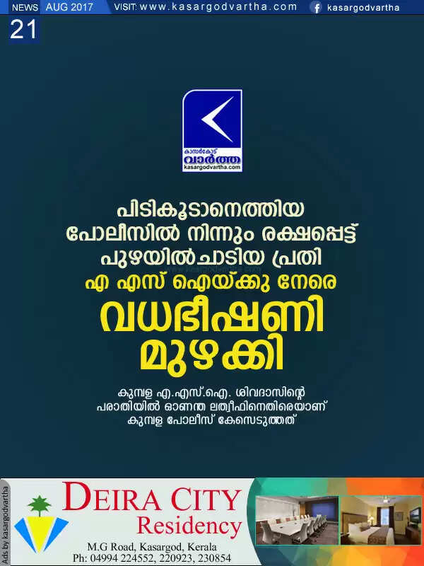 കുമ്പള: (www.kasargodvartha.com 21.08.2017) പിടികൂടാനെത്തിയ പോലീസില് നിന്നും രക്ഷപ്പെട്ട് പുഴയില്ചാടിയ പ്രതി എ എസ് ഐയ്ക്കു നേരെ വധഭീഷണി മുഴക്കിയതായി പരാതി. സംഭവത്തില് പ്രതിക്കെതിരെ പോലീസ് കേസെടുത്തു. കുമ്പള എ.എസ്.ഐ. ശിവദാസിന്റെ പരാതിയില് ഓണന്ത ലത്വീഫിനെതിരെയാണ് കുമ്പള പോലീസ് കേസെടുത്തത്.