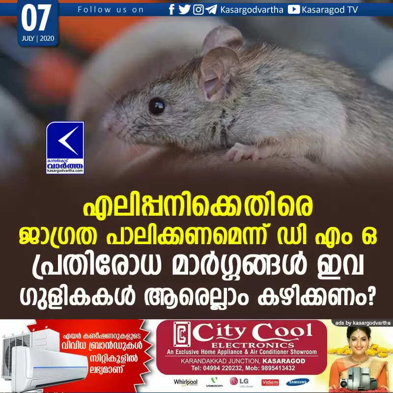 എലിപ്പനിക്കെതിരെ ജാഗ്രത പാലിക്കണമെന്ന് ഡി എം ഒ; പ്രതിരോധ മാര്ഗ്ഗങ്ങള് ഇവ, ഗുളികകള് ആരെല്ലാം കഴിക്കണം?