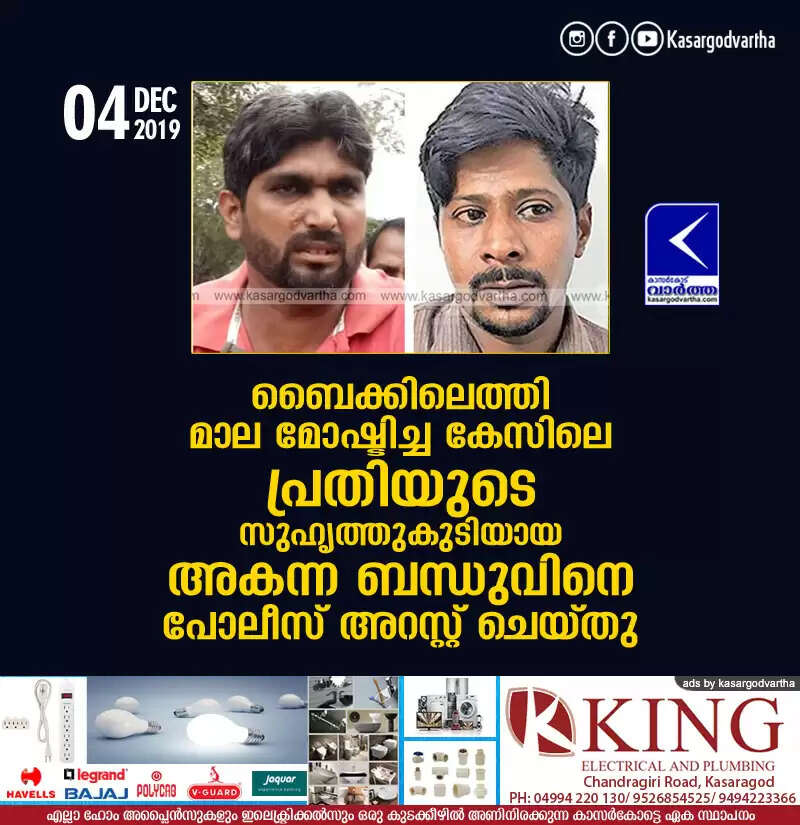 ബൈക്കിലെത്തി മാല മോഷ്ടിച്ച കേസിലെ പ്രതിയുടെ സുഹൃത്തുകുടിയായ അകന്ന ബന്ധുവിനെ പോലീസ് അറസ്റ്റ് ചെയ്തു