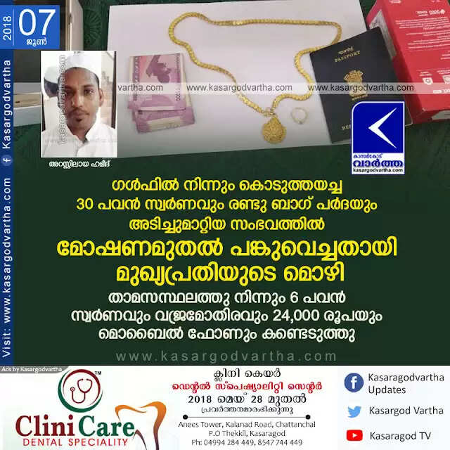 കുമ്പള: (www.kasargodvartha.com 07.06.2018) ഗള്‍ഫില്‍ നിന്നും കൊടുത്തയച്ച 30 പവന്‍ സ്വര്‍വും രണ്ടു ബാഗ് പര്‍ദയും അടിച്ചുമാറ്റിയ സംഭവത്തില്‍ മോഷണമുതല്‍ പങ്കുവെച്ചതായി മുഖ്യപ്രതിയുടെ മൊഴി. ഇതിന്റെ അടിസ്ഥാനത്തില്‍ ഇയാളുടെ താമസസ്ഥലത്ത് പോലീസ് നടത്തിയ പരിശോധനയില്‍ ആറു പവന്‍ സ്വര്‍ണവും വജ്രമോതിരവും 24,000 രൂപയും 10,000 രൂപ വിലവരുന്ന ഒരു സാംസംഗ് മൊബൈല്‍ ഫോണും കണ്ടെടുത്തു. മുഖ്യപ്രതി ഉള്ളാള്‍ സ്വദേശിയും പെര്‍വാഡ് കടപ്പുറത്ത് ക്വാര്‍ട്ടേഴ്‌സില്‍ താമസക്കാരനുമായ ഹമീദിന്റെ (34) വീട്ടില്‍ നിന്നാണ് പോലീസ് സ്വര്‍ണവും മോതിരവും പണവും കണ്ടെടുത്തത്.
