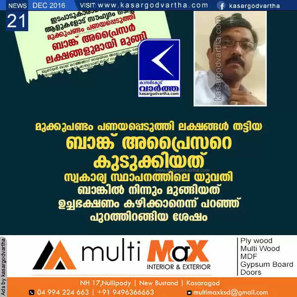 Keywords:  Kasaragod, Kerala, Kanhangad, Bank, Cheating, complaint, Police, Cheating case: police investigation for Bank appraiser.