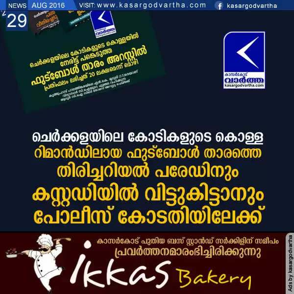ചെര്‍ക്കളയിലെ കോടികളുടെ കൊള്ള: റിമാന്‍ഡിലായ ഫുട്‌ബോള്‍ താരത്തെ തിരിച്ചറിയല്‍ പരേഡിനും കസ്റ്റഡിയില്‍ വിട്ടുകിട്ടാനും പോലീസ് കോടതിയിലേക്ക്