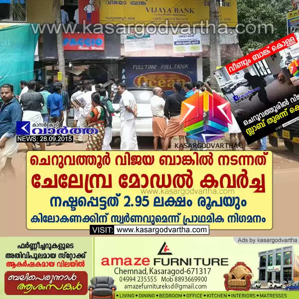 Keywords: Robbery, Bank, Cheruvathur, Kasaragod, Vijaya Bank, Bank robbery in Cheruvathur, Cheruvathur bank robbery: Gold and cash lost, Amaze Furniture