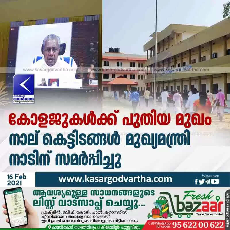 കാസർകോട്: (www.kasargodvartha.com 16.02.2021) ജില്ലയിലെ വിവിധ കോളജുകളിലെ നാല് കെട്ടിടങ്ങൾ മുഖ്യമന്ത്രി പിണറായി വിജയൻ നാടിന് സമർപ്പിച്ചു. പെരിയ ഗവ. പോളി ടെക്‌നിക് കോളജിൽ 2.3 കോടി രൂപ ചിലവഴിച്ച് നിർമിച്ച ലാബ് കെട്ടിടം, തൃക്കരിപ്പൂർ ഇ കെ നായനാർ മെമോറിയൽ ഗവ. പോളിടെക്‌നിക് കോളജിൽ 10 കോടി രൂപ ചിലവഴിച്ച് നിർമിച്ച കെട്ടിട സമുച്ചയം, കാസർകോട് ഗവ. കോളജിൽ നിർമിച്ച കാൻറീൻ കെട്ടിടവും പെൺകുട്ടികൾക്കുള്ള വിശ്രമമുറിയും, ഉദുമ ആർട്സ് ആന്റ് സയൻസ് കോളജിൽ നിർമിച്ച കെട്ടിടം എന്നിവ മുഖ്യമന്ത്രി ഉദ്ഘാടനം ചെയ്തു. ഉന്നതവിദ്യാഭ്യാസ മന്ത്രി കെ ടി ജലീൽ അധ്യക്ഷത വഹിച്ചു. അഡീഷണൽ ചീഫ് സെക്രടറി ഡോ വി വേണു സ്വാഗതം പറഞ്ഞു.