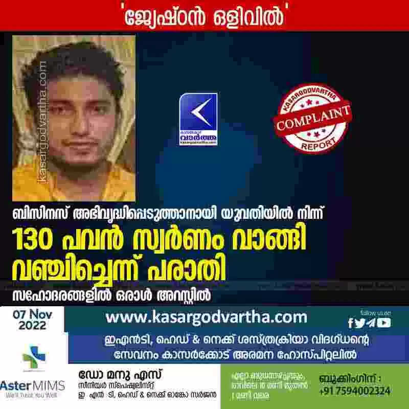 Arrested | ബിസിനസ് അഭിവൃദ്ധിപ്പെടുത്താനായി യുവതിയിൽ നിന്ന് 130 പവൻ സ്വർണം വാങ്ങി വഞ്ചിച്ചെന്ന് പരാതി; സഹോദരങ്ങളിൽ ഒരാൾ അറസ്റ്റിൽ; 'ജ്യേഷ്ഠൻ ഒളവിൽ'