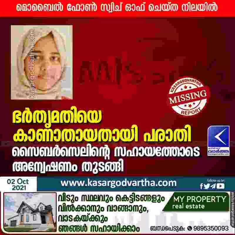 ഭര്തൃമതിയെ കാണാതായതായി പരാതി; സൈബര്സെലിന്റെ സഹായത്തോടെ അന്വേഷണം തുടങ്ങി