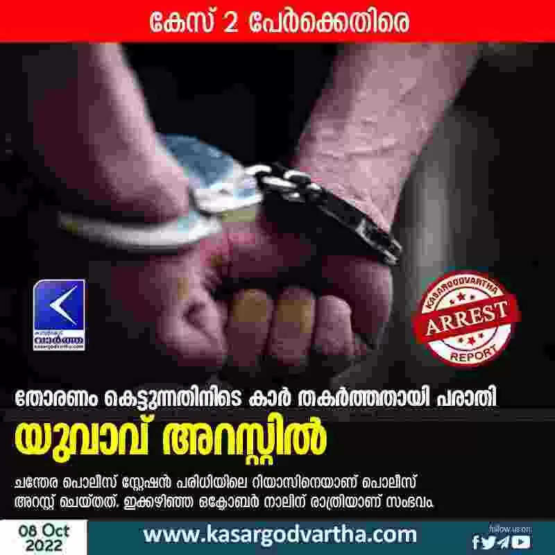 Youth arrested | തോരണം കെട്ടുന്നതിനിടെ കാര് തകര്ത്തതായി പരാതി; യുവാവ് അറസ്റ്റില്