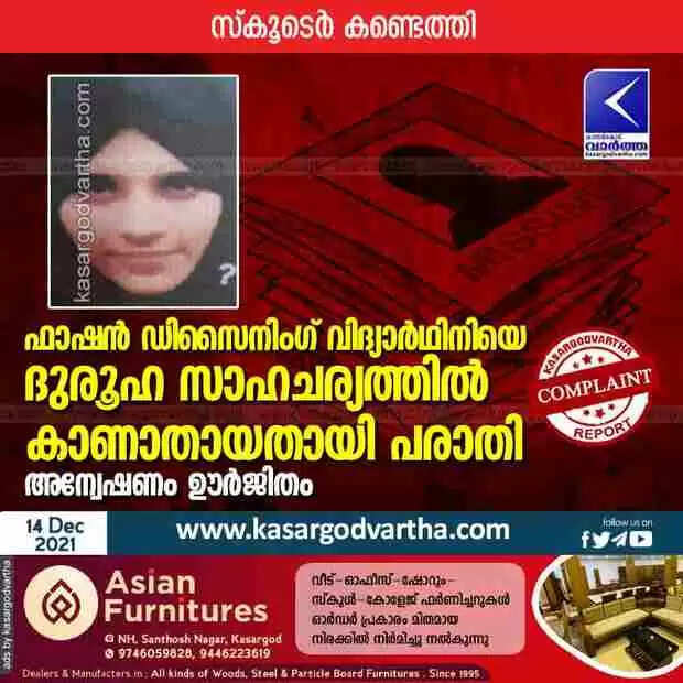 ഫാഷൻ ഡിസൈനിംഗ് വിദ്യാർഥിനിയെ ദുരൂഹ സാഹചര്യത്തിൽ കാണാതായതായി പരാതി; അന്വേഷണം ഊർജിതം; സ്കൂടെർ കണ്ടെത്തി