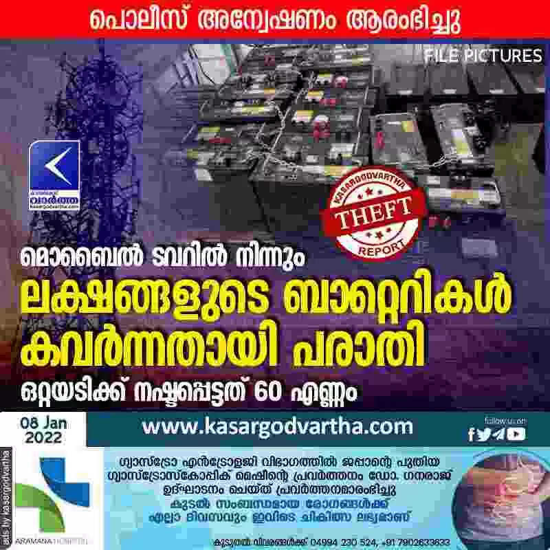 Keywords: Kumbala, Kasaragod, Kerala, News, Top-Headlines, Police, Mobile tower, Mobile Phone, Investigation, Theft, Robbery, Complaint that lakhs of batteries stolen from the mobile tower.
