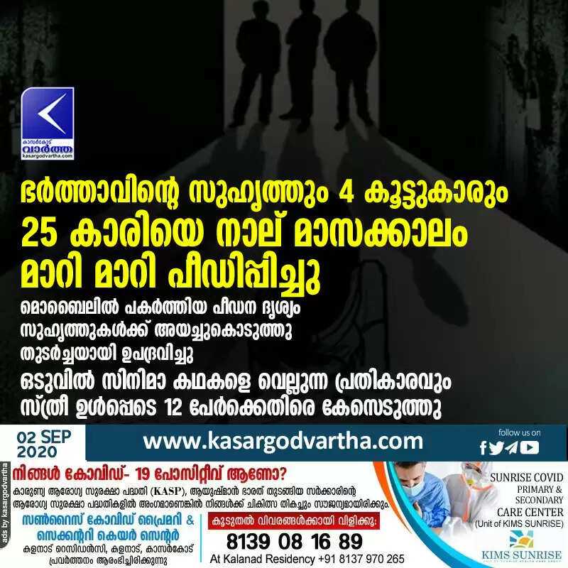 ഭർത്താവിൻ്റെ സുഹൃത്തും 4 കൂട്ടുകാരും 25 കാരിയെ നാല് മാസക്കാലം മാറി മാറി പീഡിപ്പിച്ചു; മൊബൈലിൽ പകർത്തിയ പീഡന ദൃശ്യം സുഹൃത്തുകൾക്ക് അയച്ചുകൊടുത്തു തുടർച്ചയായി ഉപദ്രവിച്ചു; ഒടുവിൽ സിനിമാ കഥകളെ വെല്ലുന്ന പ്രതികാരവും; സ്ത്രീ ഉൾപ്പെടെ 12 പേർക്കെതിരെ കേസെടുത്തു