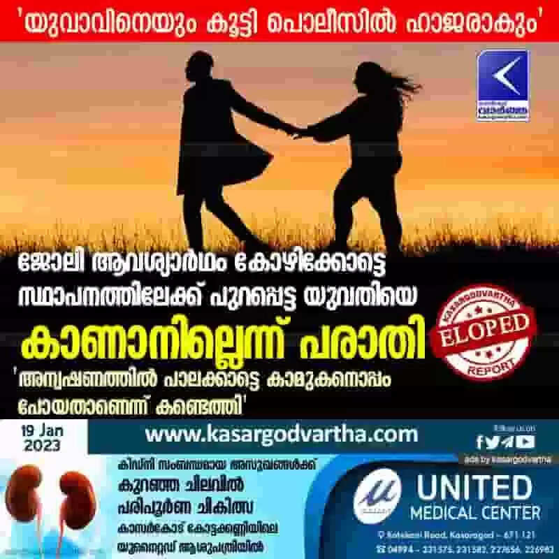 ഇക്കഴിഞ്ഞ ഡിസംബര്‍ 13 നാണ് താമരശേരിയിലെ യുവതി സ്ഥാപനത്തിലേക്ക് പോയതെന്നും പിന്നീട് യുവതിയെ സ്ഥാപനത്തില്‍ അന്വേഷിച്ചപ്പോള്‍ കണ്ടെത്താനായില്ലെന്നും ബന്ധുക്കള്‍ പറഞ്ഞു. തുടര്‍ന്ന് ഹൊസ്ദുര്‍ഗ് പൊലീസില്‍ പരാതി നല്‍കിയതിന്റെ അടിസ്ഥാനത്തില്‍ അന്വേഷണം നടത്തിയപ്പോഴാണ് പാലക്കാട്ടുകാരനായ കാമുകനൊപ്പം പോയതാണെന്ന് കണ്ടെത്തിയതെന്ന് പൊലീസ് വൃത്തങ്ങള്‍ അറിയിച്ചു.