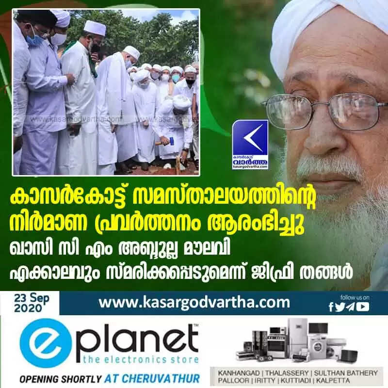 കാസർകോട്ട് സമസ്താലയത്തിന്റെ നിർമാണ പ്രവർത്തനം ആരംഭിച്ചു; ഖാസി സി എം അബ്ദുല്ല മൗലവി എക്കാലവും സ്മരിക്കപ്പെടുമെന്ന് ജിഫ്രി തങ്ങൾ