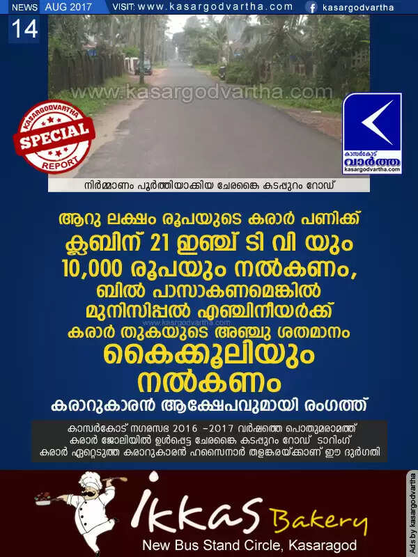 ആറു ലക്ഷം രൂപയുടെ കരാര് പണിക്ക് ക്ലബിന് 21 ഇഞ്ച് ടി വി യും 10,000 രൂപയും നല്കണം; ബില് പാസാകണമെങ്കില് മുനിസിപ്പല് എഞ്ചിനീയര്ക്ക് കരാര് തുകയുടെ അഞ്ചു ശതമാനം കൈക്കൂലിയും നല്കണം, കരാറുകാരന് ആക്ഷേപവുമായി രംഗത്ത്