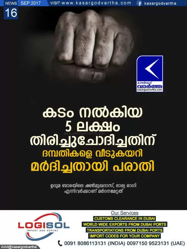 ഉദുമ: (www.kasargodvartha.com 16.09.2017) കടം നല്കിയ 5 ലക്ഷം തിരിച്ചുചോദിച്ചതിന് ദമ്പതികളെ വീടുകയറി മര്ദിച്ചതായി പരാതി. ഉദുമ ബാരയിലെ ഷണ്മുഖദാസ് (44), ഭാര്യ രാഗി (32) എന്നിവര്ക്കാണ് മര്ദനമേറ്റത്. ഇവരെ ആശുപത്രിയില് പ്രവേശിപ്പിച്ചു. വെള്ളിയാഴ്ച ഉച്ചയോടെയാണ് സംഭവം. അടുത്ത ബന്ധുക്കളായ ആറു പേരാണ് മര്ദിച്ചതെന്ന് ആശുപത്രി കഴിയുന്ന ഷണ്മുഖ ദാസ് പരാതിപ്പെട്ടു.