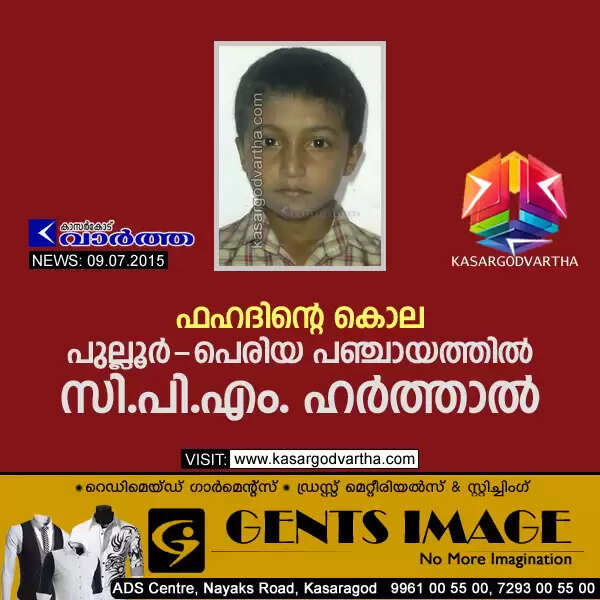 പെരിയ: (www.kasargodvartha.com 09/07/2015) പെരിയ ഗവണ്മെന്റ് ഹൈസ് സ്കൂളിലെ മൂന്നാം ക്ലാസ് വിദ്യാര്ത്ഥി ഫഹദിനെ (എട്ട്) ക്രൂരമായി വെട്ടിക്കൊന്ന സംഭവത്തില് പ്രതിഷേധിച്ച് സി.പി.എം. ആഹ്വാനപ്രകാരം പുല്ലൂര്-പെരിയ പഞ്ചായത്തില് ഹര്ത്താല്.