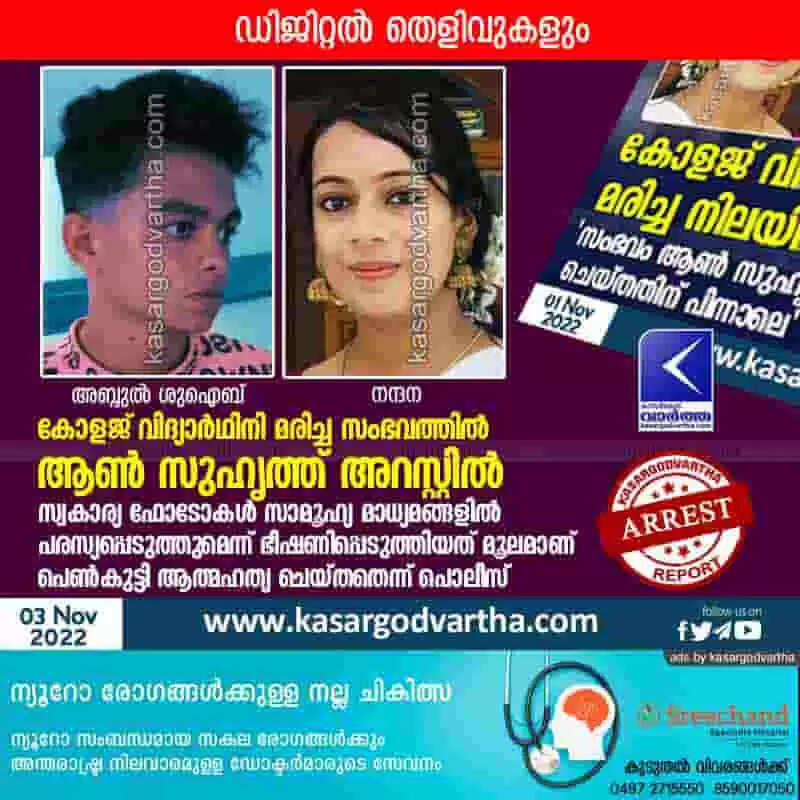 കാഞ്ഞങ്ങാട് അലാമിപള്ളിയിലെ കെ വി വിനോദ് കുമാര്-കെ എസ് മിനി ദമ്പതികളുടെ മകളും പടന്നക്കാട് ഇ കെ നായര് ആര്ട്സ് ആന്ഡ് സയന്സ് കോളജിലെ ബിരുദ വിദ്യാര്ഥിനിയുമായ നന്ദന വിനോദി(20)ന്റെ മരണവുമായി ബന്ധപ്പെട്ടാണ് ആണ് സുഹൃത്ത് ഹൊസ്ദുര്ഗ് പൊലീസ് സ്റ്റേഷന് പരിധിയിലെ എം കെ അബ്ദുല് ശുഐബി(20)നെ അറസ്റ്റ് ചെയ്തത്.