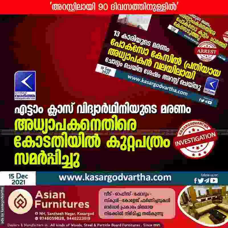 Keywords: Kerala, News, Kasaragod, Chattanchal, Top Headlines, School, Student, Death, Teacher, Case, Police, Investigation, Melparamba, Death of eighth grade student; A chargesheet was filed in court against the teacher.