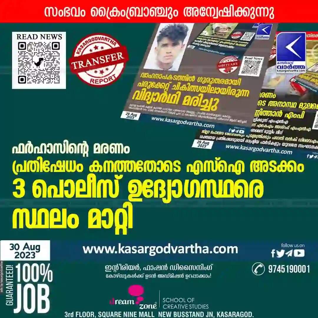 Keywords: News, Kumbala, Kasaragod, Kerala, Transferred, Protest, Police, Angadimogar, Investigation, Accident, Death of Farhas: 3 police officers including SI transferred.