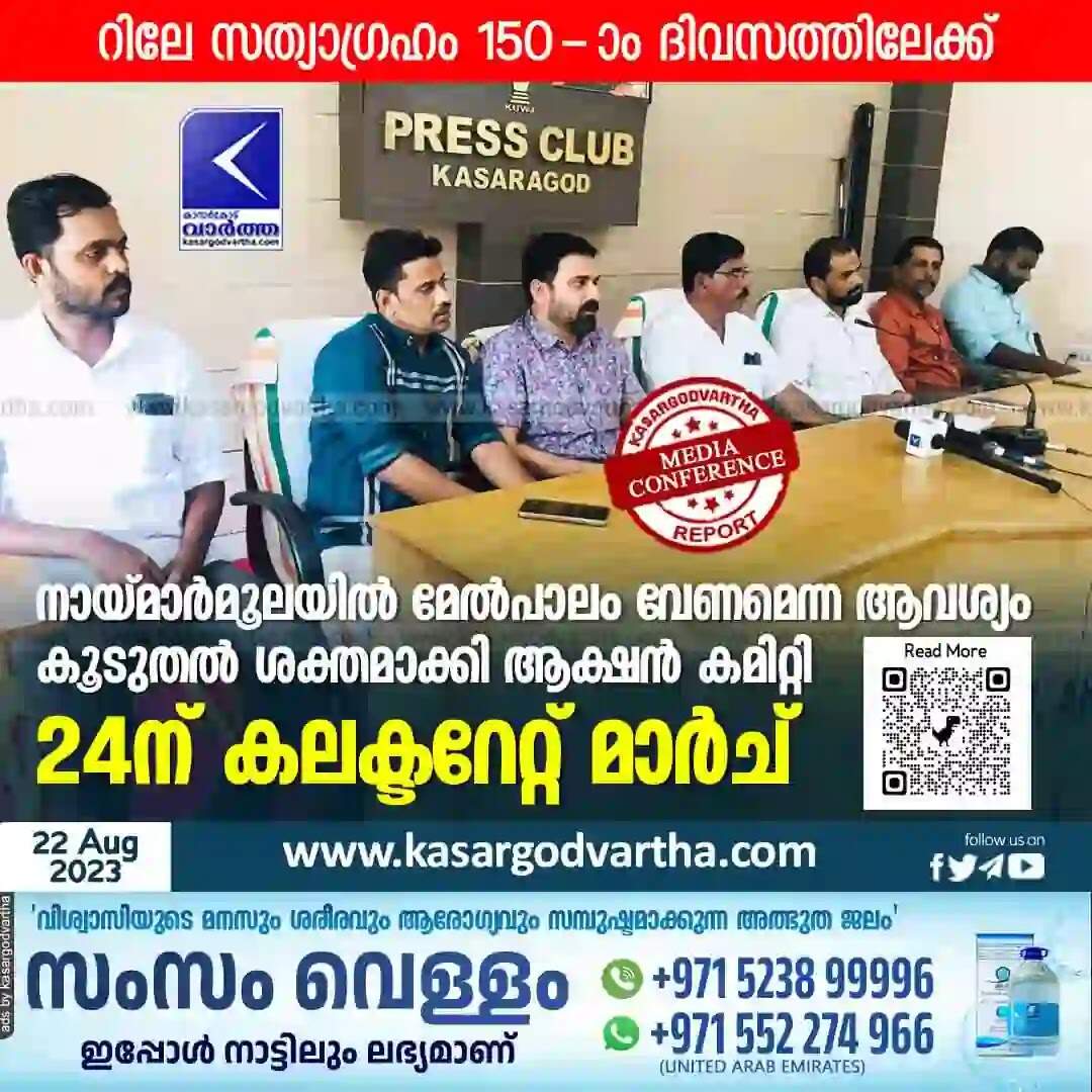 കാസര്‍കോട്: (www.kasargodvartha.com) ദേശീയപാത വികസനത്തില്‍ ഇരുഭാഗങ്ങളിലുമായി ഒറ്റപ്പെട്ടു പോകുന്ന നായ്മാര്‍മൂലയില്‍ മേല്‍പാലം നിര്‍മിക്കണമെന്ന് ആവശ്യപ്പെട്ട് ആക്ഷന്‍ കമിറ്റി നടത്തിവരുന്ന റിലേസത്യാഗ്രഹ സമരത്തിന്റെ 150-ാം ദിവസമായ ഓഗസ്റ്റ് 24ന് കലക്ടറേറ്റ് മാര്‍ച് നടത്തുമെന്ന് ഭാരവാഹികള്‍ വാര്‍ത്താസമ്മേളനത്തില്‍ അറിയിച്ചു. രാവിലെ 10 മണിക്ക് സമരപന്തലില്‍ നിന്ന് മാര്‍ച് ആരംഭിക്കും.