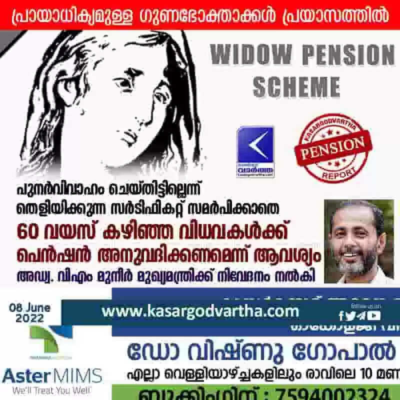 Keywords: Demands to grant pension to widows above 60 years of age without submission of certificate proving non-remarriage, Kerala, Kasaragod, News, Top-Headlines, Window Pension, Certificates, Government.