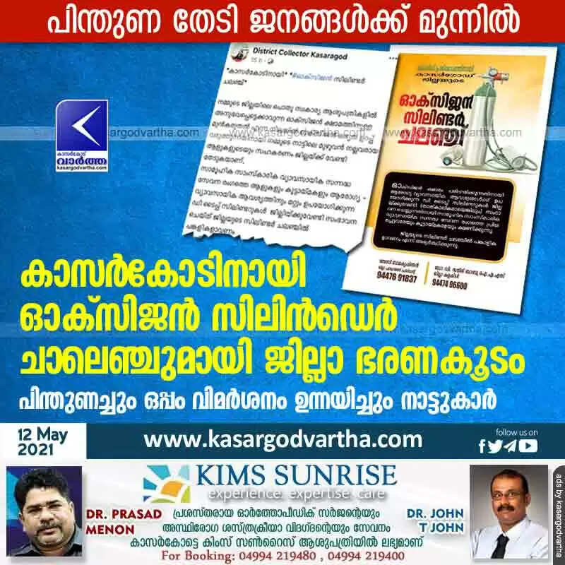 കാസർകോടിനായി ഓക്സിജൻ സിലിൻഡെർ ചാലെഞ്ചുമായി ജില്ലാ ഭരണകൂടം; പിന്തുണച്ചും ഒപ്പം വിമർശനം ഉന്നയിച്ചും നാട്ടുകാർ