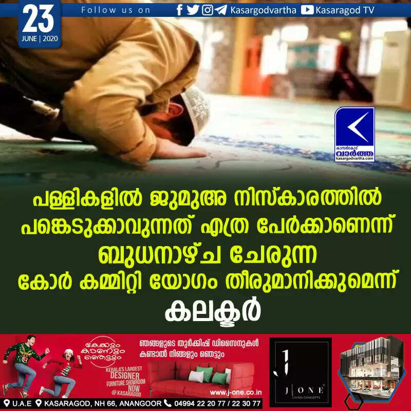 പള്ളികളില്‍ ജുമുഅ നിസ്‌കാരത്തില്‍ പങ്കെടുക്കാവുന്നത് എത്ര പേര്‍ക്കാണെന്ന് ബുധനാഴ്ച ചേരുന്ന കോര്‍ കമ്മിറ്റി യോഗം തീരുമാനിക്കുമെന്ന് കലക്ടര്‍