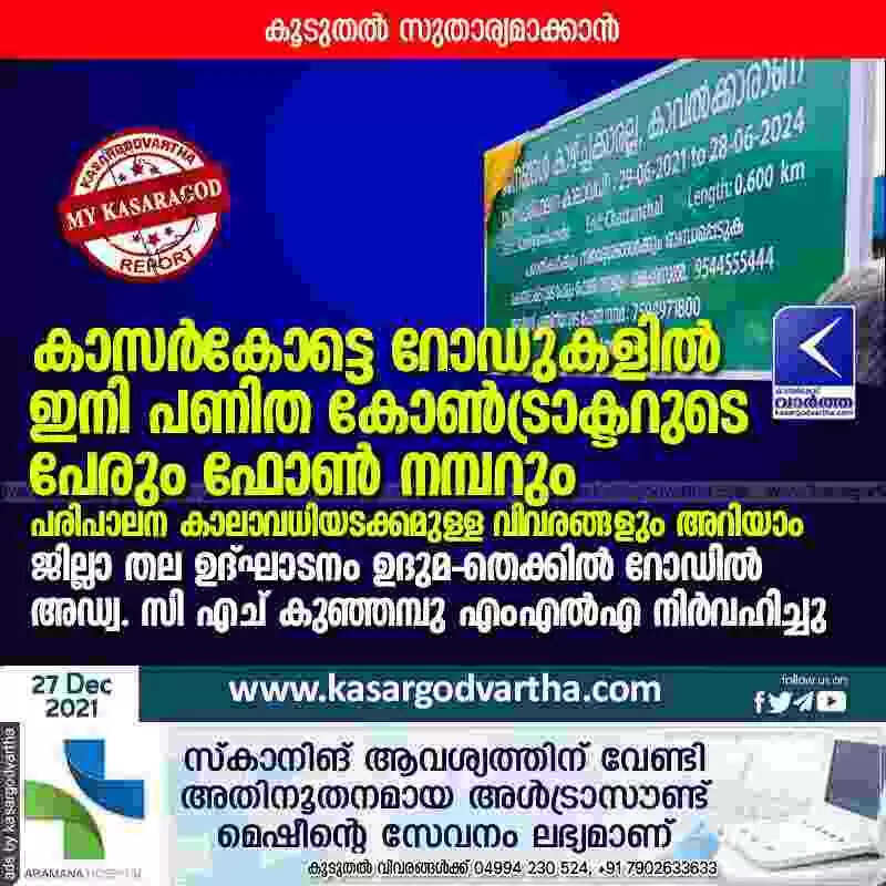 കാസർകോട്ടെ റോഡുകളിൽ ഇനി പണിത കോൺട്രാക്ടറുടെ പേരും ഫോൺ നമ്പറും പരിപാലന കാലാവധിയടക്കമുള്ള വിവരങ്ങളും അറിയാം; ജില്ലാ തല ഉദ്ഘാടനം നിർവഹിച്ചു