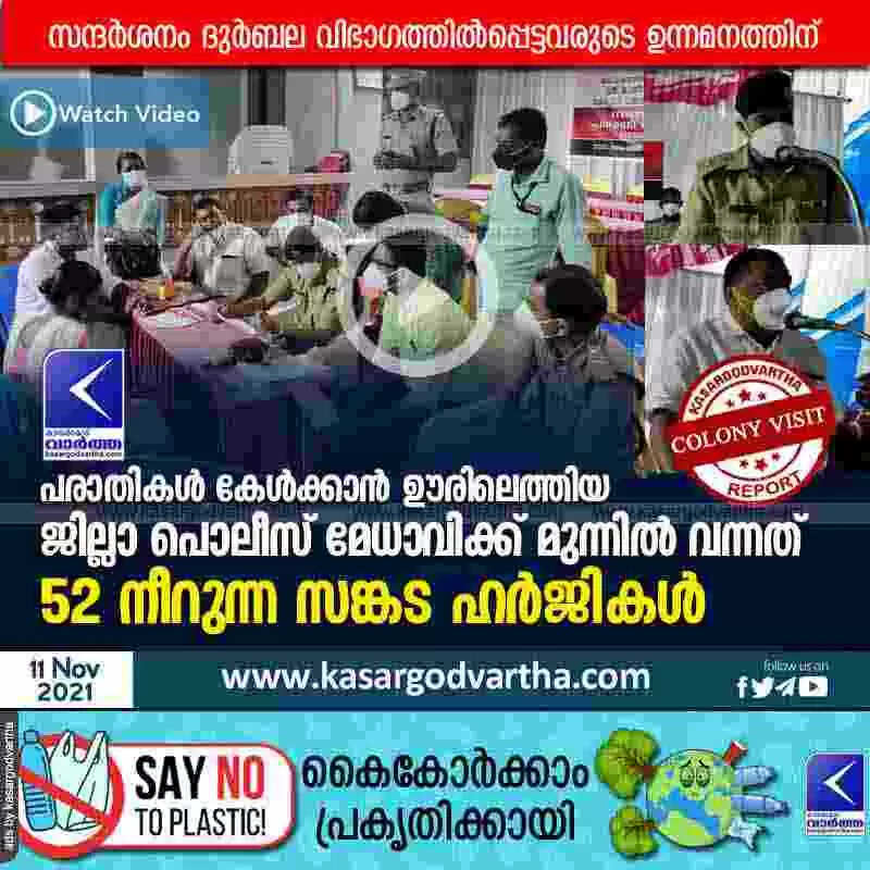 ജില്ലയിലെ എസ് ടി കോളനിയിൽ കഴിയുന്ന ദുർബല വിഭാഗത്തിൽപ്പെട്ടവരുടെ പരാതികൾ നേരിട്ട് കേൾക്കാനും അവരെ കാണാനും ആവശ്യമായ നടപടികൾ കൈകൊള്ളാനുമായിരുന്നു പൊലീസ് മേധാവിയുടെ വരവ്. വെള്ളരിക്കുണ്ട് പൊലീസ് സ്റ്റേഷൻ പരിധിയിൽ വരുന്ന പാല വളപ്പിൽ കോളനിയിൽ വന്ന പൊലീസ് മേധാവി മുൻപാകെ 52 പരാതികളാണ് എത്തിയത്.