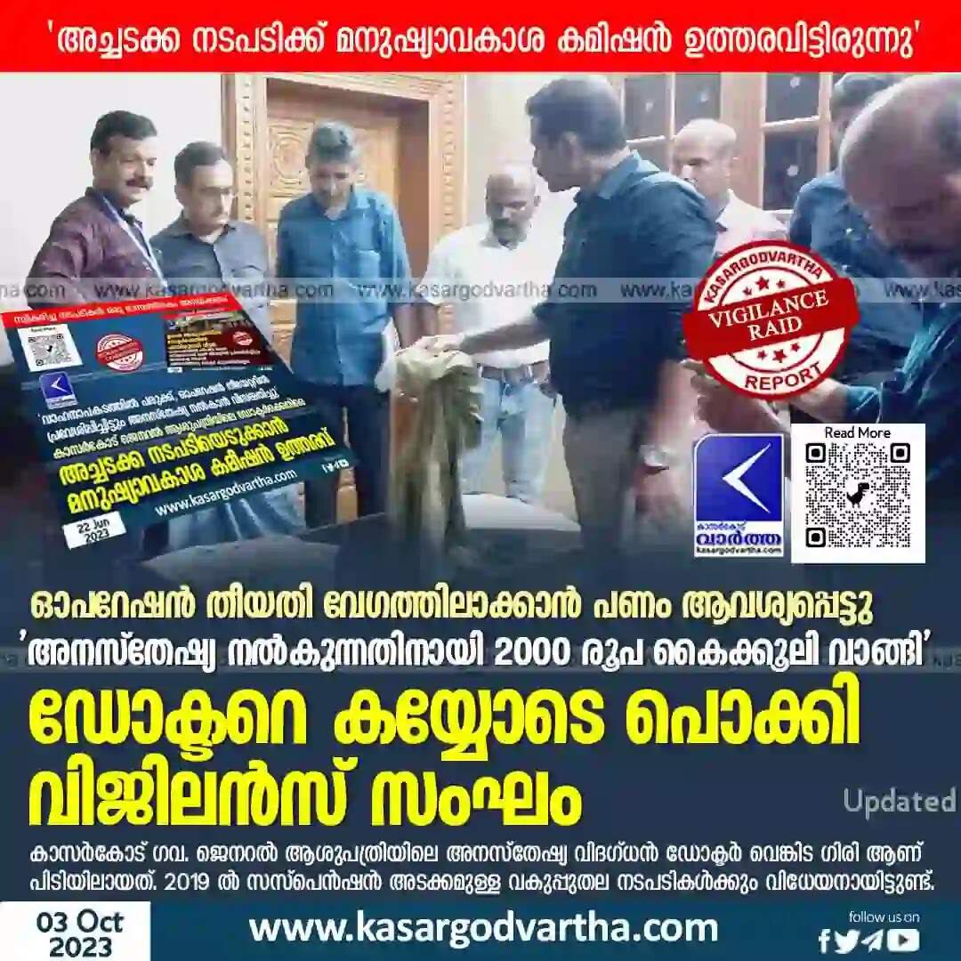 Keywords: Doctor arrested for allegedly demanding bribe for surgery, Kasaragod, News, Doctor, Arrested, Bribe, Vigilance, Complaint, Treatment, Kerala News. < !- START disable copy paste -->