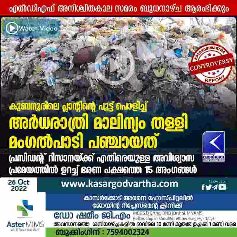 Dumped Waste | കുബനൂരിലെ പ്ലാന്റിന്റെ പൂട്ട് പൊളിച്ച് അര്ധരാത്രി മാലിന്യം തള്ളി മംഗല്പാടി പഞ്ചായത്; എല്ഡിഎഫ് അനിശ്ചിത കാല സമരം ബുധനാഴ്ച ആരംഭിക്കും; പ്രസിഡന്റ് റിസാനയ്ക്ക് എതിരെയുള്ള അവിശ്വാസ പ്രമേയത്തില് ഉറച്ച് ഭരണ പക്ഷത്തെ 15 അംഗങ്ങള്