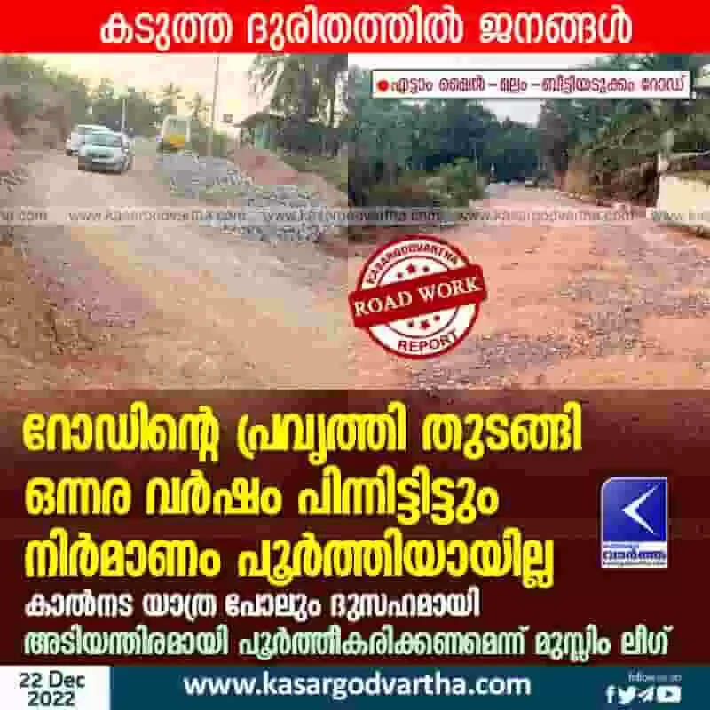 Road Work | റോഡിന്റെ പ്രവൃത്തി തുടങ്ങി ഒന്നര വര്ഷം പിന്നിട്ടിട്ടും നിര്മാണം പൂര്ത്തിയായില്ല; കാല്നട യാത്ര പോലും ദുസഹമായി; കടുത്ത ദുരിതത്തില് ജനങ്ങള്; അടിയന്തിരമായി പൂര്ത്തീകരിക്കണമെന്ന് മുസ്ലിം ലീഗ്