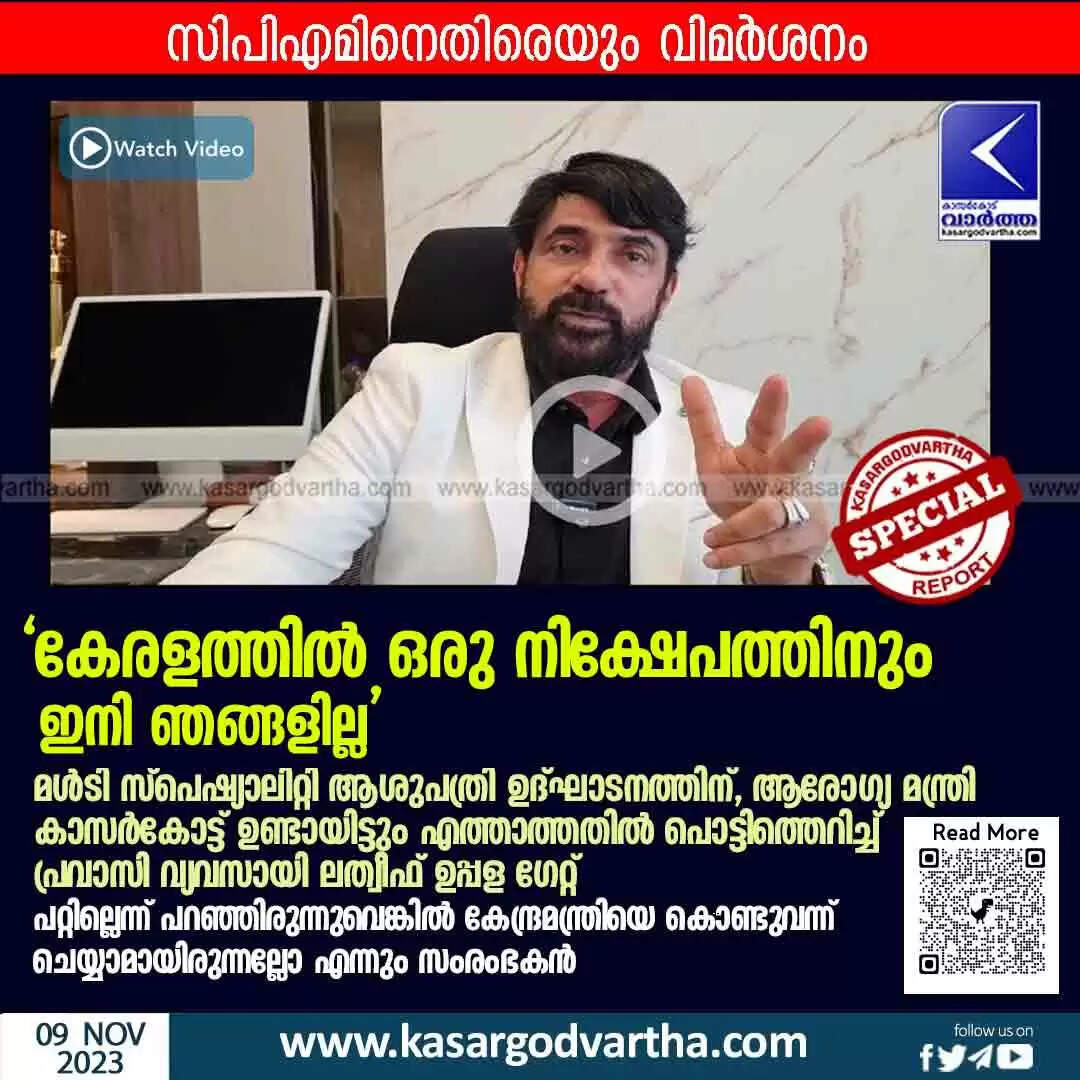 Hospital | 'കേരളത്തിൽ ഒരു നിക്ഷേപത്തിനും ഇനി ഞങ്ങളില്ല'; മള്ടി സ്പെഷ്യാലിറ്റി ആശുപത്രി ഉദ്ഘാടനത്തിന്, ആരോഗ്യ മന്ത്രി വീണാ ജോർജ് കാസർകോട്ട് ഉണ്ടായിട്ടും എത്താത്തതിൽ പൊട്ടിത്തെറിച്ച് പ്രവാസി വ്യവസായി ലത്വീഫ് ഉപ്പള ഗേറ്റ്; സിപിഎമിനെതിരെയും വിമർശനം; പറ്റില്ലെന്ന് പറഞ്ഞിരുന്നുവെങ്കിൽ കേന്ദ്രമന്ത്രിയെ കൊണ്ടുവന്ന് ചെയ്യാമായിരുന്നല്ലോ എന്നും സംരംഭകൻ